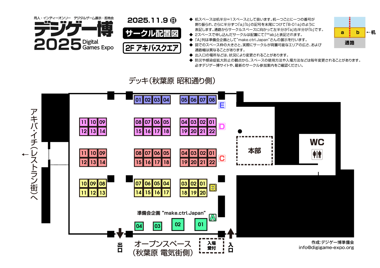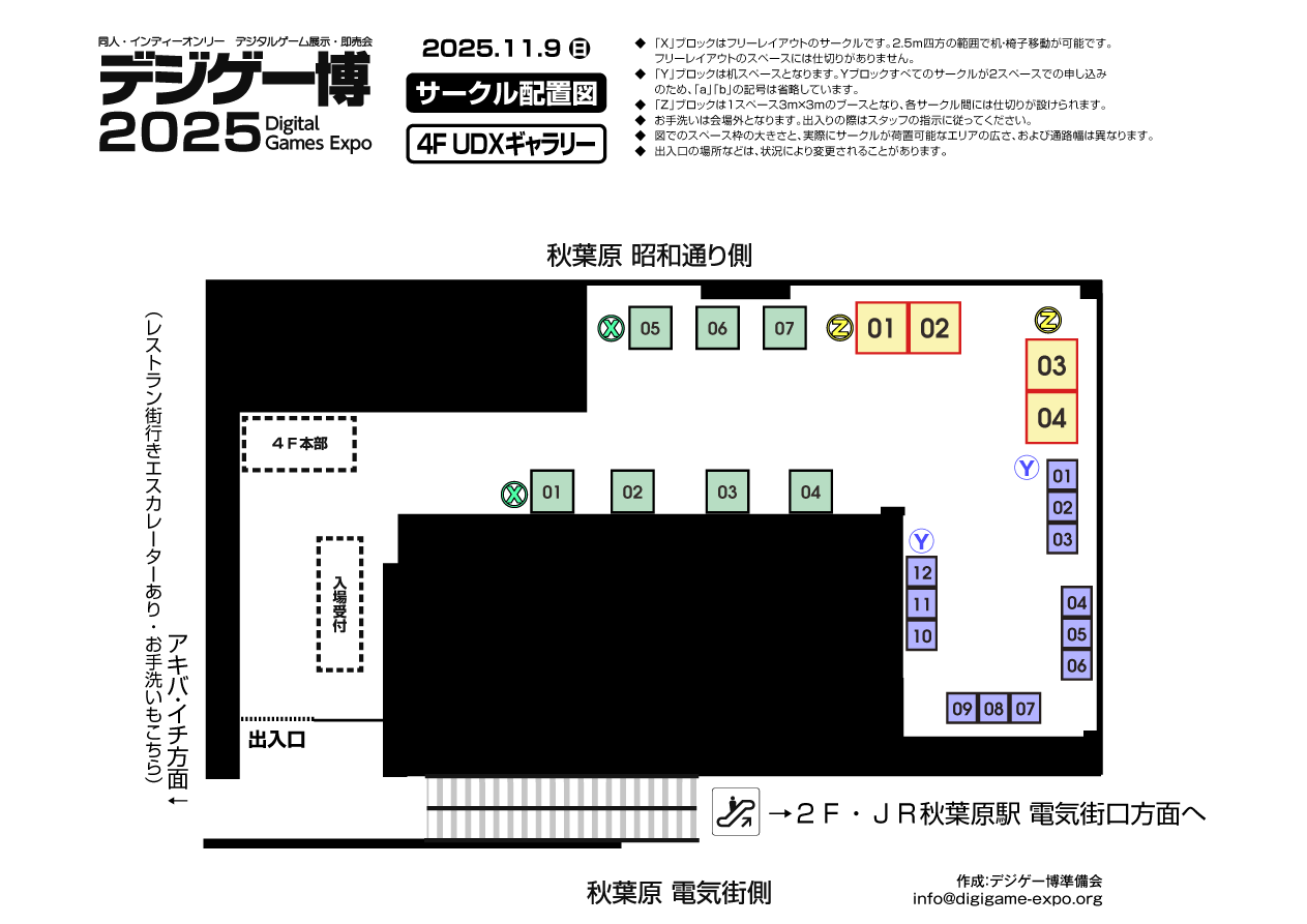 - ブロック記号「A」から「F」は2階・アキバ・スクエア会場に、「X」から「Z」は4F・UDXギャラリー会場に配置されます。