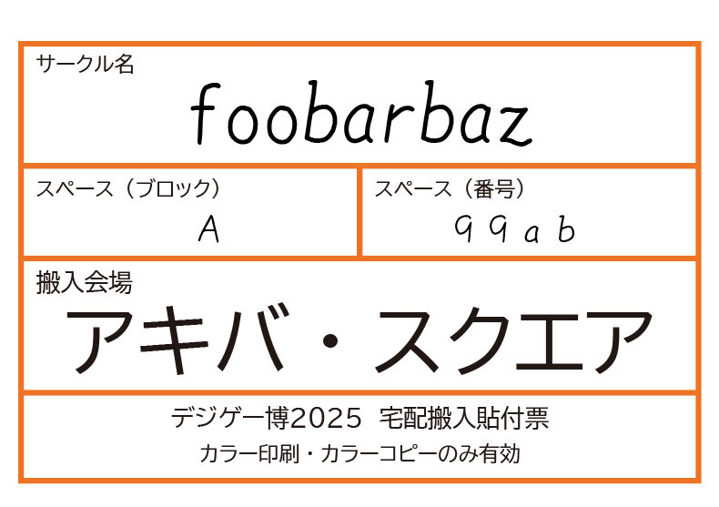 宅配搬入票は2階用・4階用で別になっています。ご自分のサークルスペースのある会場をお確かめください。 宅配搬入票(2F用)ダウンロード 宅配搬入票(4F用)ダウンロード 宅配搬入票の記入例 画像は2Fの搬入票の例です。 宅配搬入票の使い方・ご注意 A4サイズにカラーで印刷後、必要な分だけ切り取ってご使用ください。 見やすい位置に、配送途中で剥がれないようしっかりと貼り付けてください。 白黒印刷の搬入票は無効です。